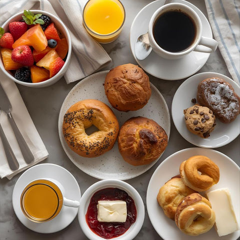 An assortment of bagels, muffins and pastries. Served with orange juice and coffee