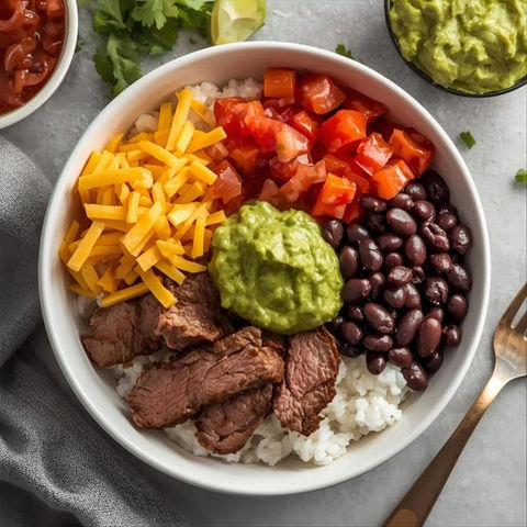Classic Mexican rice bowls served with steak and a choice of brown or white rice , black beans, corn, Pico de Gallo, sour cream, cheddar cheese and guacamole