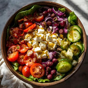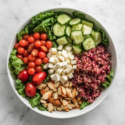 Kale, romaine, feta, grape tomatoes, red and white quinoa and toasted almonds with Greek dressing