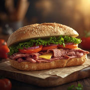 Roast beef, cheddar, mayonnaise, onions, lettuce and tomatoes on ciabatta
