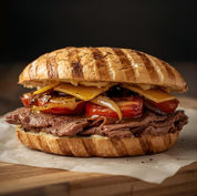 Roast beef, cheddar cheese, caramelized onions, oven roasted tomatoes & horseradish sauce on ciabatta