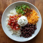 Jasmine rice , Pico de gallo, corn salsa, sour cream, cheddar cheese, black beans.
