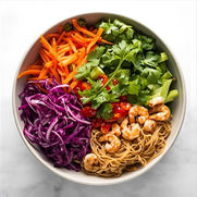Romaine, red cabbage, green cabbage, carrots, cilantro, scallions, red peppers, diced shrimp, crispy noodles, and a house made peanut dressing